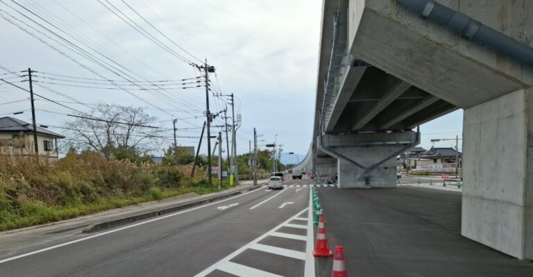 都城志布志道路の志布志道路区間の完成に伴い、県道志布志福山線の舗装工事を行いました。施工延長は130mで、車道部及び志布志道路の高架下である中央部を上層路盤、中間層及び表層を施工し、併せて交差点内の横断歩道や誘導線を含む区画線も施工しました。